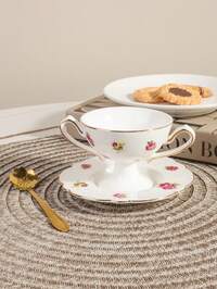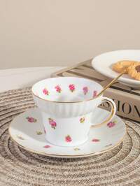 6pcs European Style Tea Cup & Saucer Set, Gold Rim, 2.8oz Ceramic Coffee Cup And Saucer, Suitable For Breakfast, Afternoon Tea, Tea Party, Home, Garden, Restaurant And Other Occasions. Drinkware For Summer And Winter, Tea Cup And Saucer Set, Essential For Back To School Season.