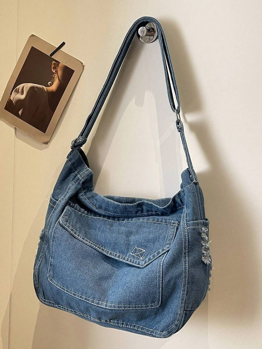 Solid Color Denim Portable Zipper Fashion Hobo Bag, Large Capacity Shoulder Bag, Crossbody Bag, Must-Have Shopping Bag For Women, Tote Bag, Suitable For Girls, Ladies, College Students Commuting, Outdoor Travel And Daily Use