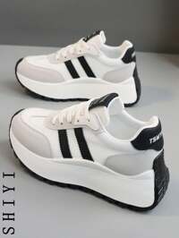 Clunky SneakerWomen's Fashion Casual Sport Shoes, Punk Metal Ox Head Decoration Chain Pendant Shoes Accessories, Dark Style Sport Shoes With Breathable Mesh Upper,Lightweight Shock Absorbing Sole, Round Toe Lace Up Casual Shoes For College Students, Teens, Daily, Date, Fitness, Office. 7CM Platform Chunky Heel High Top Outdoor Casual Sneakers, All Season Black High Heels